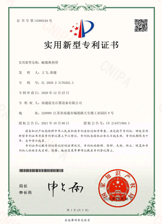 實用新型專利 :石墨換熱器 專利號:ZL 2019 2 1407837.2
